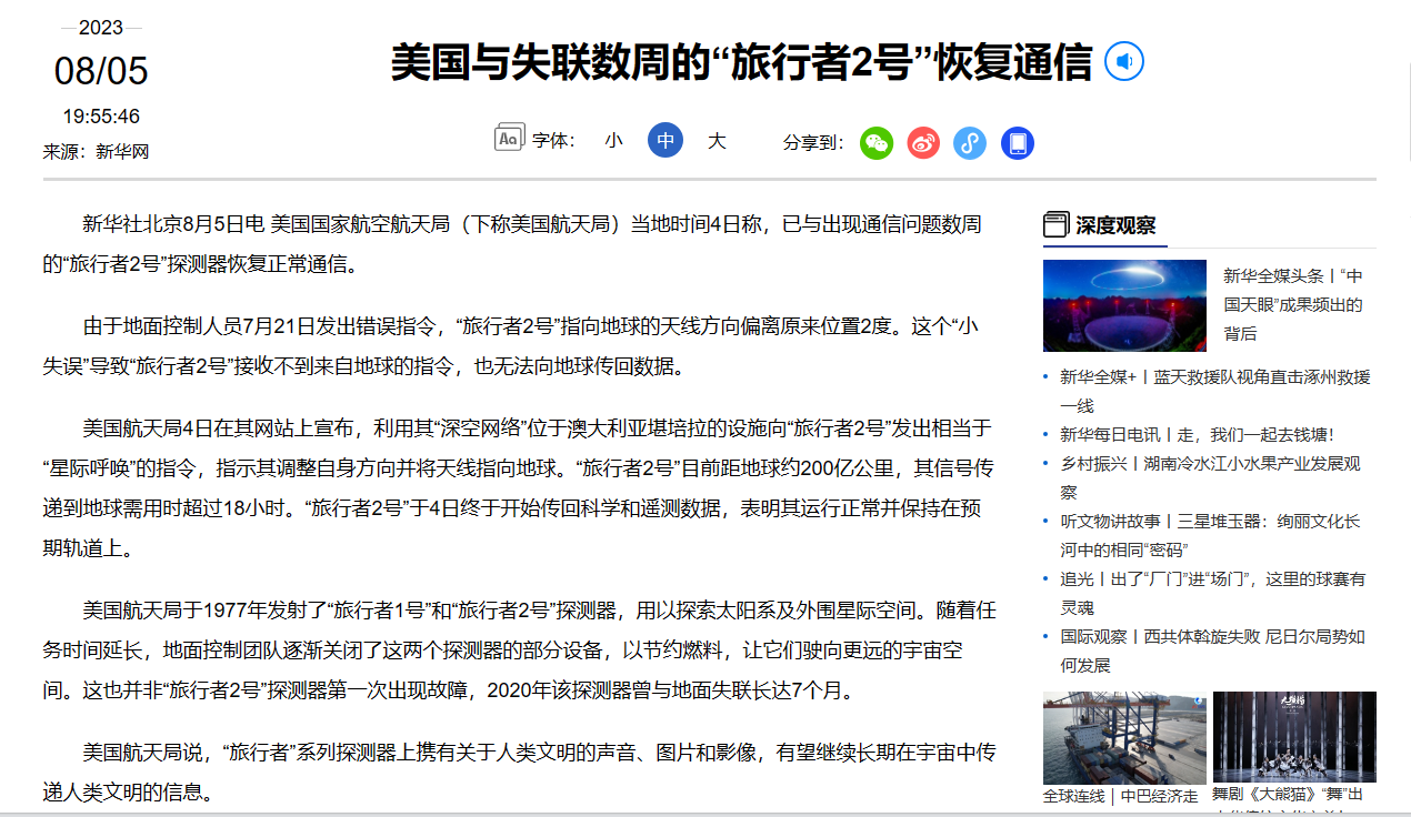 在此之前,旅行者号还在2020年“失联”过一次,但那次是完全在意料之中的,因为那时候深空测控网在维护升级。等到维护完成之后,NASA重启深空测控网,然后将天线重新瞄准旅行者号建立通讯,一切安好。